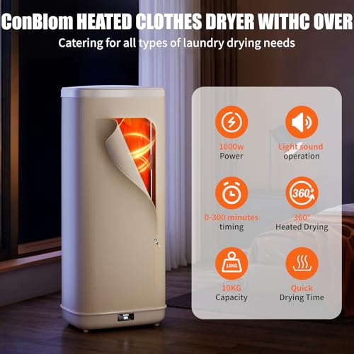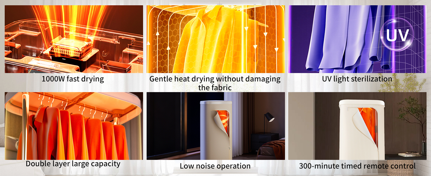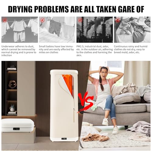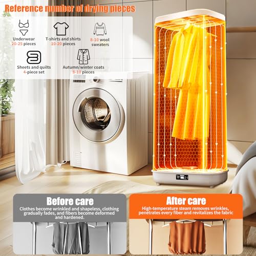 EFFICIENT & POWERFUL DRYING – Equipped with 1000W high-performance heating technology, this portable clothes dryer ensures fast and thorough drying by circulating hot air 360° around garments. It significantly reduces drying time and minimizes wrinkles, saving energy and ironing effort.