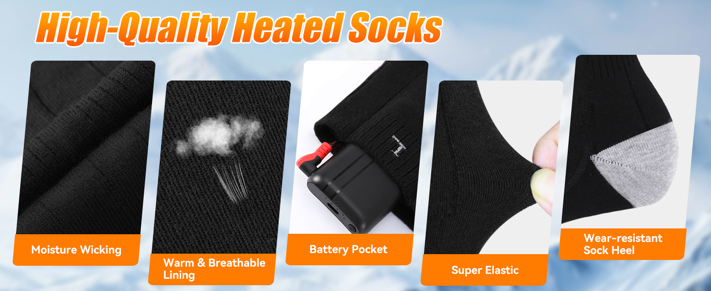 - UPGRADED HEATING ELEMENT – Our upgraded heated socks feature a new heating element that's scattered in the fabric and covers the entire front of the feet and toes area, you can hardly feel its existence. The heated socks warms up evenly, avoiding localized overheating or burning. The upgraded heated socks are warmer and safer than other socks, you can feel the temperature in 20 seconds, keeping your feet warm and comfortable in the cold winter.