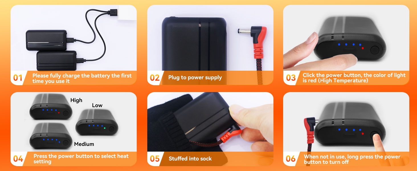- ENJOY WINTER SPORTS – Get ready for winter! Cold feet can often take the fun out of any outdoor activity. Heated socks are perfect for many kinds of indoor & outdoor activities in winter such as camping, hunting, skiing, hiking, snowboarding climbing and walking, etc. It is a perfect warm gift for yourself, families and friends in winter. If you have any questions, please feel free to contact us and we'll reply within 24 hours.