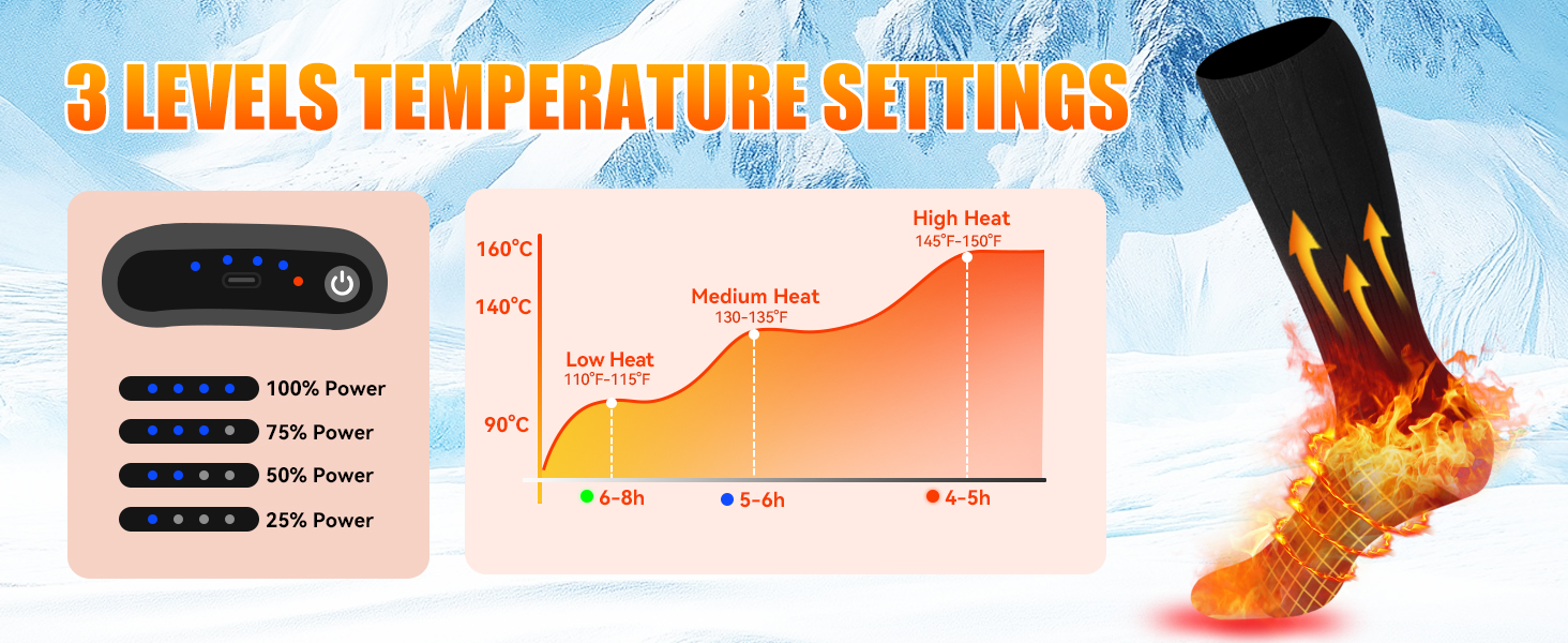 - 3 LEVELS TEMPERATURE ADJUSTABLE – The heated socks for men and women come with 3 temperature settings, so you can choose temperature you need depending on the weather, including high heat(145℉-150℉, 4-5 hours), medium heat(130-135℉, 5-6 hours), and low heat(110℉-115℉, 6-8 hours). The electric socks can keep your feet warm, promote blood circulation and make your feet no longer cold and stiff in the cold winter.