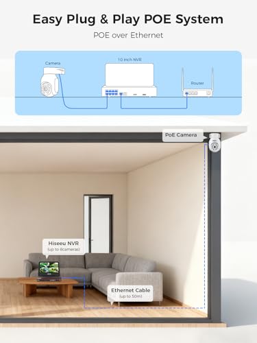 • 【Stable Connection, 50M Strong Signal】Du to all the Hiseeu POE security cameras are ultra-reliable connection through a single Ethernet cable, integrating power and video transmission, do not need the power adapter. So you will get more stable and stronger signal than the WiFi connection even install the cameras 50 meters from the NVR. These wired cameras are equipped with anti-interference technology to ensure stable signal integrity even in thick walls and long-distance installations (over 50 M).