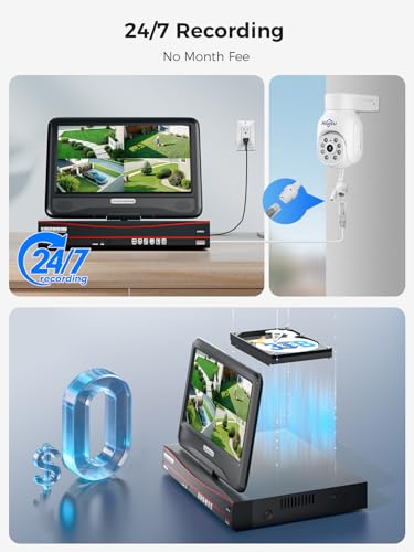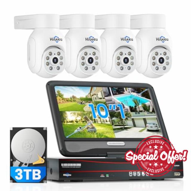 Hiseeu【5MP+PTZ】5MP 8CH NVR POE CCTV Security Camera System with 30M Color Night Vision, 10″ Monitor with 3TB HDD, 4X5MP Outdoor POE IP Cameras, Motion Detection,APP Alarm,24/7 Recording,Remote Access