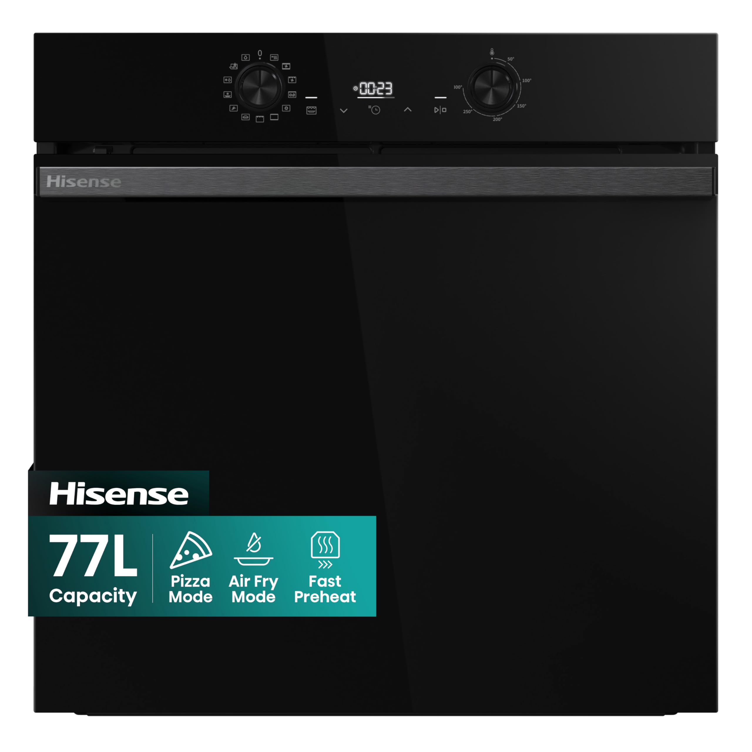 Upgrade your kitchen with the Hisense Hi2 BI626PBUPUK Built-In Electric Single Pyrolytic Oven, designed to deliver outstanding performance with effortless convenience. The generous 77L capacity and even bake technology offer plenty of space and consistent, perfectly cooked results whether you’re hosting guests or batch cooking. Craving authentic, restaurant-style pizza? Pizza mode reaches an impressive 300°C for crisp bases and gooey toppings, while fast preheat gets the oven to 200°C in just 5 minutes – ideal for busy weeknights. Cleaning is made effortless with pyrolytic cleaning, which heats the oven to high temperatures to turn grime into ash for an easy wipe down. The intuitive display with push-in dials makes selecting functions simple and seamless, combining precise control with a sleek, minimalist look. Finished in jet black glass, the Hi2 brings together premium design, practical features and everyday simplicity – perfect for modern homes.