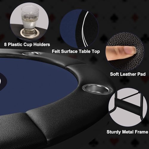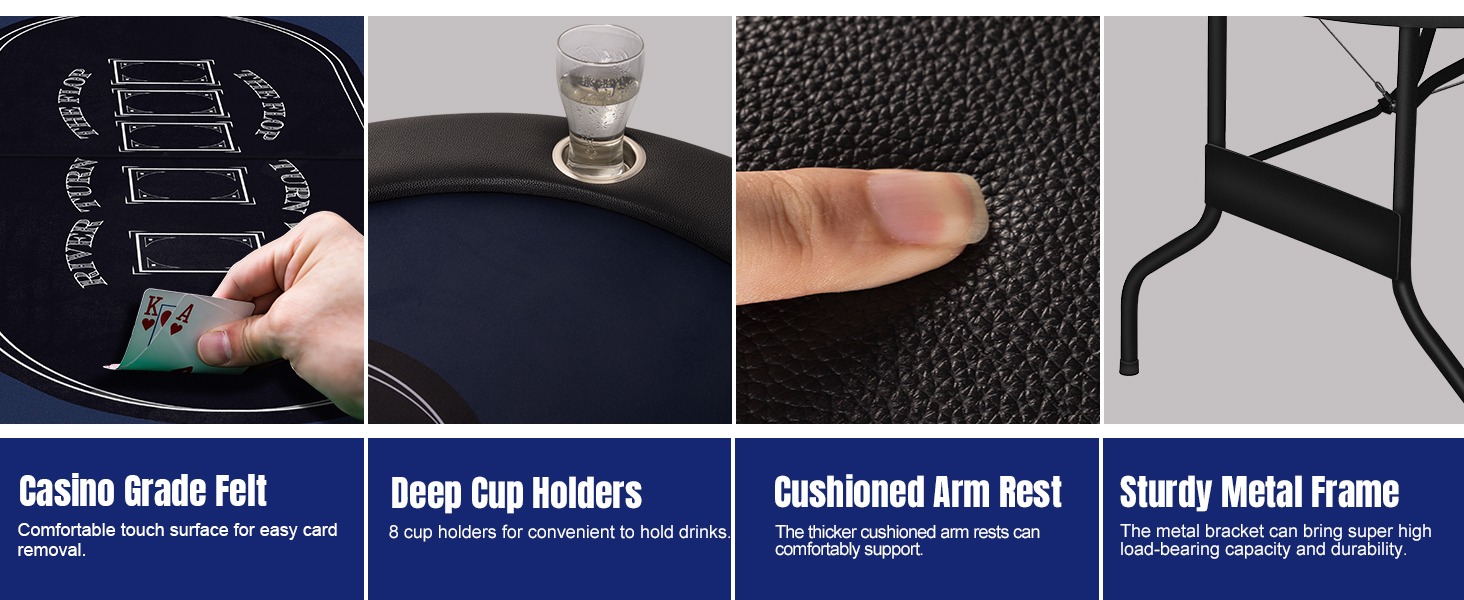 CASINO-GRADE DURABILITY: Reinforced steel frame & 3mm thickened playing surface resist warping and spills—making this poker table 2X more stable during intense games. made of casino-grade felt surface,which is comfortable to touch and can reduce the sound when items are dropped, giving you a better gaming experience.