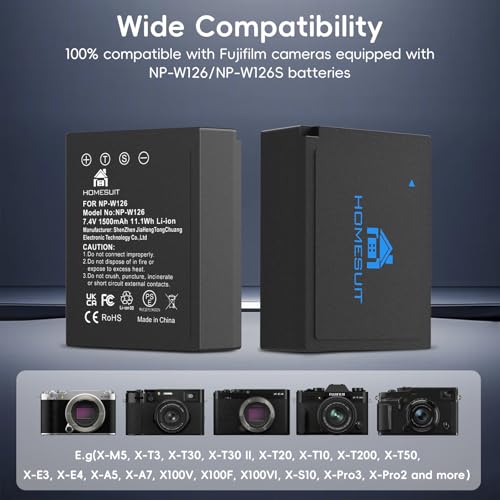 Homesuit NP-W126 NP-W126S Battery 1500mAh and LCD Charger for Fuji XT30II XT30 XT20 XT10 X100V X100VI X100F X-T3 X-T2 X-T1 XA1 XA2 XA3 X-E3 X-E2 X-E1 X-H1 X-M1 Xpro3 Xpro2 Xpro1 (2 Pack)
