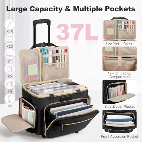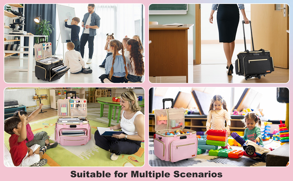 - Large Storage Space: The rolling teacher bag has a spacious main compartment that can accommodate binders, folders, notebooks, books, and more. 3 mesh pockets can store phones, hand cream, markers, umbrellas, etc., while 2-layer cushioned bag can store 17'' laptops and iPads. The top cover features a large zippered mesh bag and multiple pen pockets for convenient storage of signature pens, DIY tools, etc.