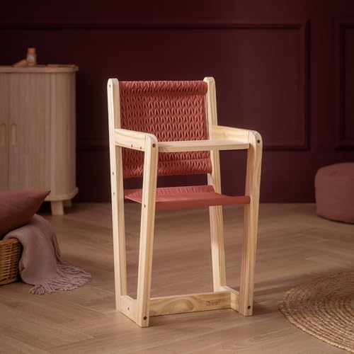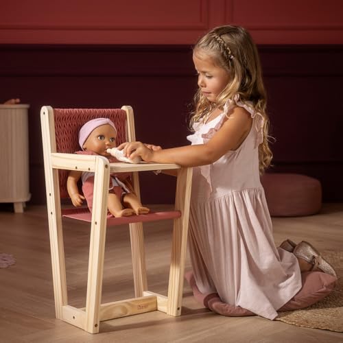 The doll's high chair impresses with its modern design and loving details. The fabric elements are in a warm brick red tone.