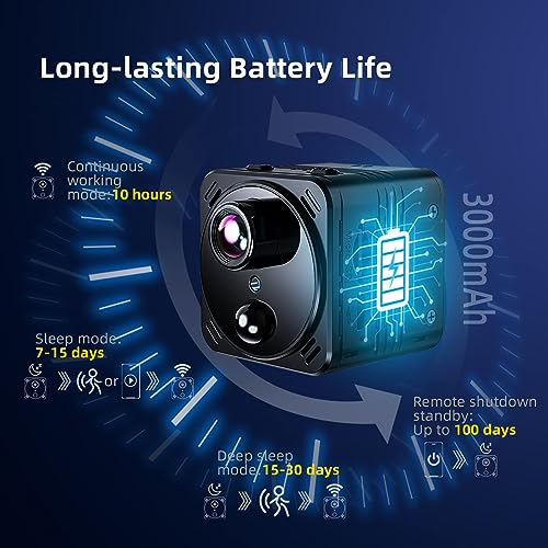 Extended Battery Life & Intelligent Energy Use: This nanny cam boasts a 3000mAh rechargeable battery for up to 10 hours of continuous recording on a single charge. Activate the (deep) sleep mode for 7-30 days of usage, based on PIR sensor triggers. For remote shutdown, the battery can last up to 100 days, conveniently controlled via the app.
