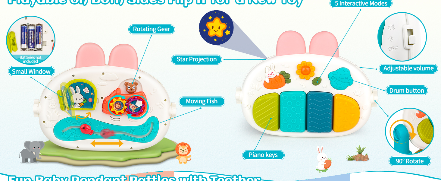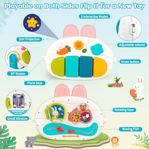 【Upgraded Piano with Adjustable Volume】Use this baby piano to stimulate sensory fun! The foot-controlled piano keys have soft lights and a star projection light. It can rotate 90°, and has 5 modes: Music/Scales/Animals/Sounds/Whack-A-Mole and 2 volume levels. It can be played from both sides. It is the perfect sensory toy for babies 0-6 months and 6-12 months old
