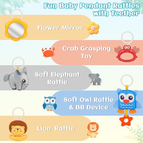 【5 Detachable Hanging Toys】Includes a teething lion rattle ,crab grasper, soft elephant rattle,owl squeaker and a flower mirror. These toys stimulate the senses, develop grasping skills, and improve hand-eye coordination. Easily detachable for play anytime, anywhere