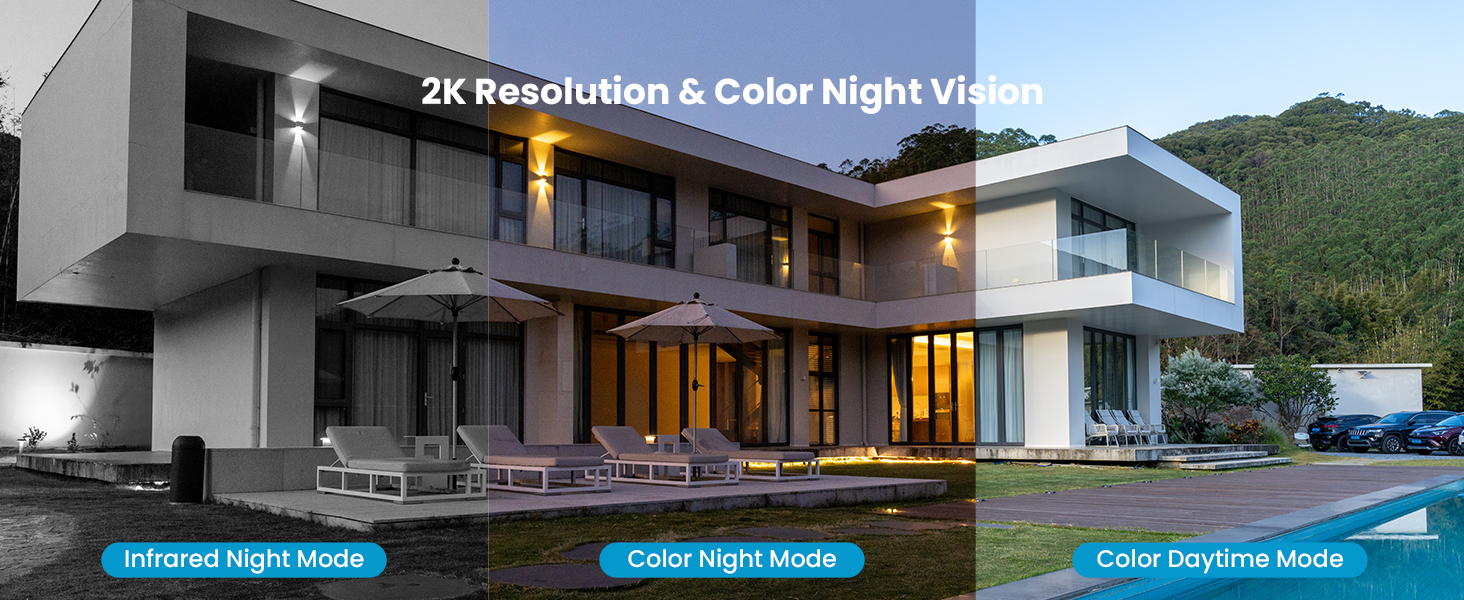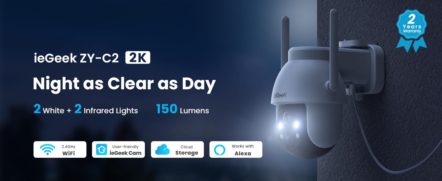 - 2K Crystal Image + 360° View + 15M Color Night Vision: ieGeek security camera outdoor has 3MP high pixel and 4x digital zoom, providing you with more details than 1080P. The cctv camera system has 355° horizontal rotation and 120° tilt functions to avoid monitoring blind spots and protect home security in all aspects. Equipped with 2 IR lights and 2 LED, cctv solar brings you clear color night vision like daytime and allows you to customize your best night vision experience.(No auto-tracking)