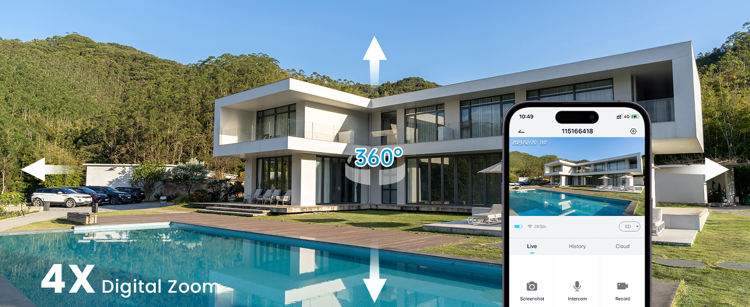 The solar camera has a 355°Pan &120°tilt monitoring range, reducing blind spots.(Not auto-tracking)