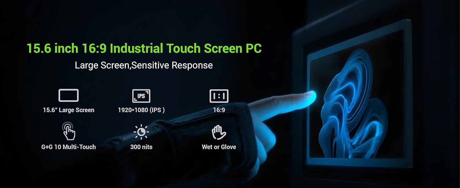 - 15.6-inch touchscreen industrial tablet PC – With a Full HD 1920×1080 resolution that ensures crisp images even in bright light conditions, this industrial 16:9 wide format display ensures maximum compatibility with specialized software. Equipped with a high-sensitivity 10-point G+G capacitive touch, this Windows PC panel provides precise and smooth interaction with fast response, supporting wet hands and gloves operation, ideal for versatile use in a variety of industries.