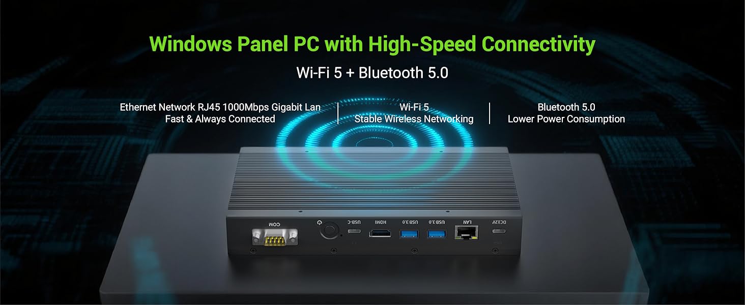 - Industrial PC with High Speed Wireless Connection-This industrial touchscreen PC is equipped with high-speed Wi-Fi 5 for greatly improved signal reception. With built-in Bluetooth 5.0 technology, it ensures low latency, stable transmission and extended range, while the 1000M LAN port ensures a seamless connection in any environment.