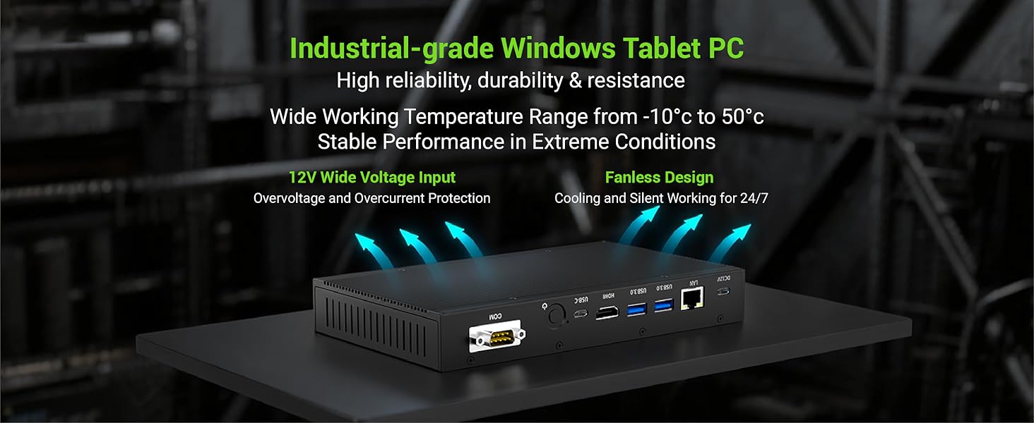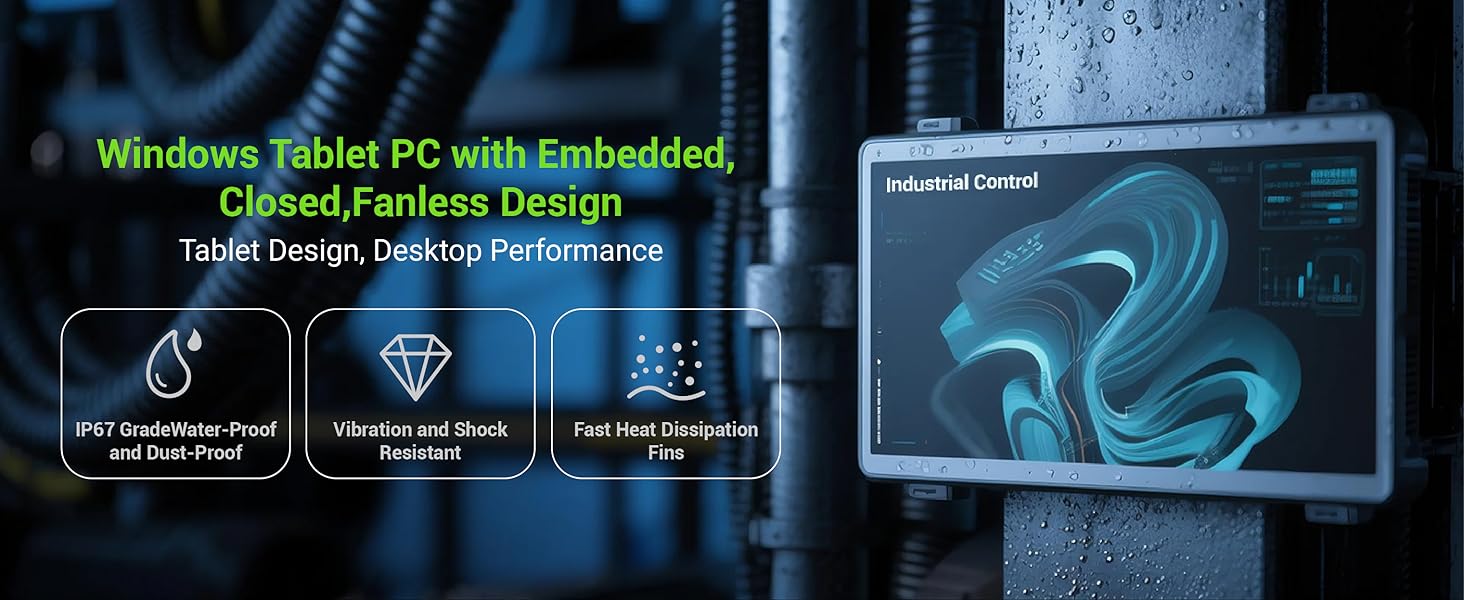 - Fanless Industrial Panel PC with Sealed Design – This Windows 11 industrial tablet features a fanless design for virtually silent operation. The waterproof front face, fully sealed moisture-resistant back coating and lightweight aluminum alloy construction offer protection against vibration and shock, making it the ideal solution for extreme industrial environments.