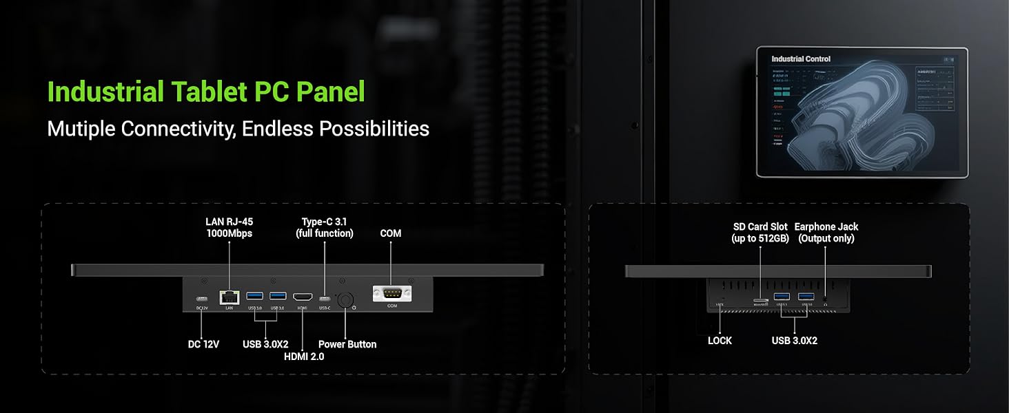- Computer Panel PC with Versatile Connectivity-This industrial mini PC with panel is compatible with various industrial controls, displays and monitors with up to 4 USB 3.0 ports, 2 RS232 serial ports, 1 Type-c3.1 port (full function), 1 HDMI port, 1 RJ45 Gigabit Ethernet port, 1 DC power input, 1 audio jack.