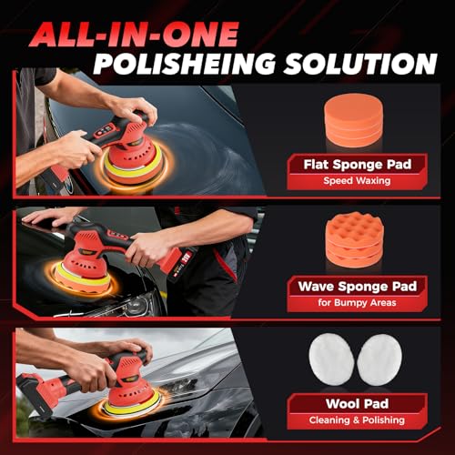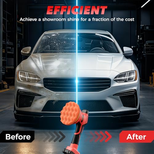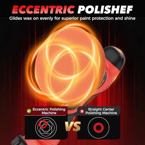 【8-Speed Pro Mode for Precision Work】Speed fom 2800RPM to 6200RPM, this car polishers and buffers adapts to 6 tasks: low speed 1-2 gear : safe waxing (cars/wood), medium speed 3-5 gear: medium polishing (leather/furniture), high speed 6-8 gear for removal paint defects, ideal for cars, boats, motorcycles, marble, and floors, featuring an advanced eccentric shaft design, utilizing eccentric vibration polishing to ensure wax penetrates deeply into the car paint, meeting both daily and professional needs for a car buffer polisher machine.
