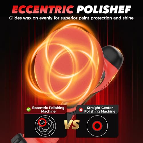 【8-Speed Pro Mode for Precision Work】Speed fom 2800RPM to 6200RPM, this car polishers and buffers adapts to 6 tasks: low speed 1-2 gear : safe waxing (cars/wood), medium speed 3-5 gear: medium polishing (leather/furniture), high speed 6-8 gear for removal paint defects, ideal for cars, boats, motorcycles, marble, and floors, featuring an advanced eccentric shaft design, utilizing eccentric vibration polishing to ensure wax penetrates deeply into the car paint, meeting both daily and professional needs for a car buffer polisher machine.