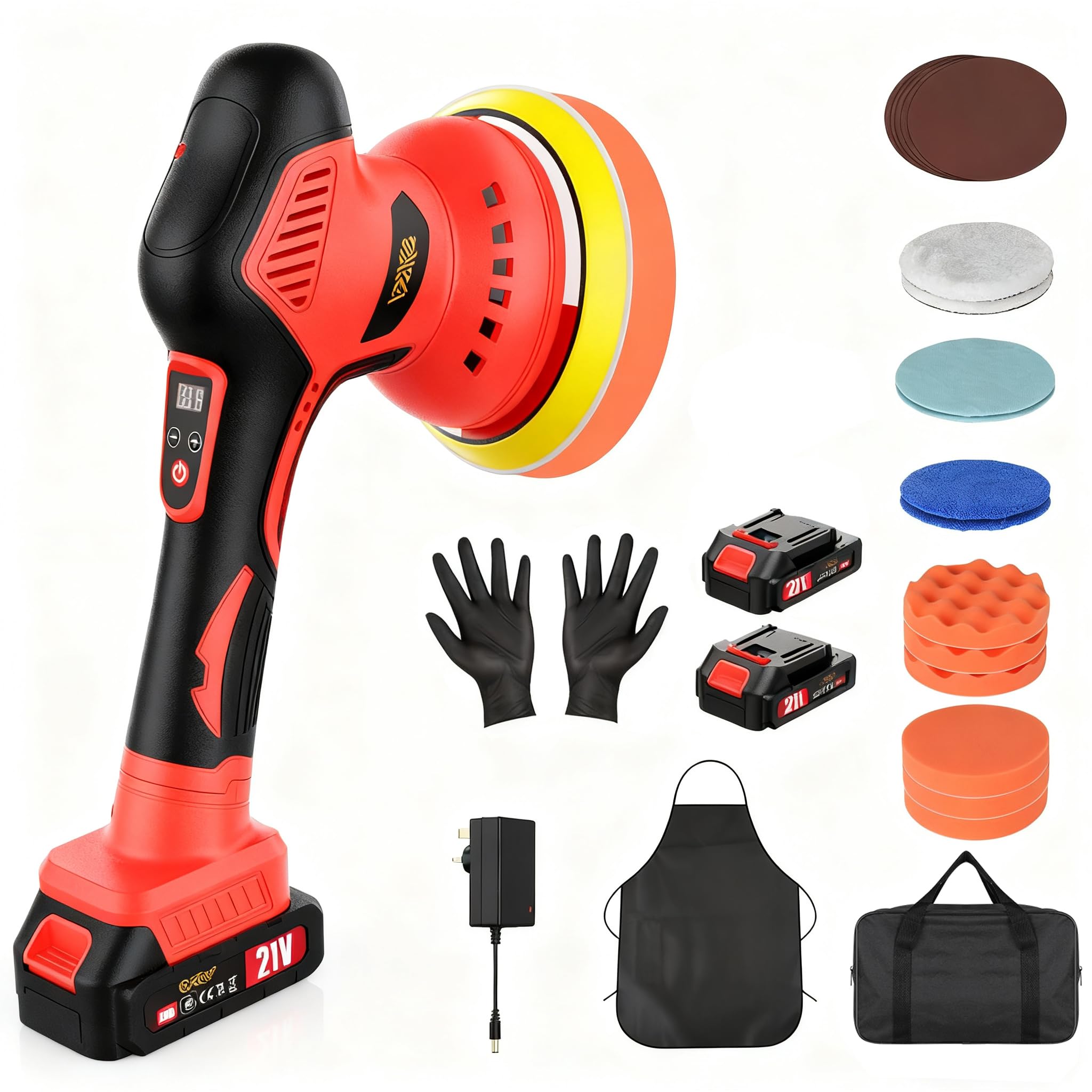 【21-in 1 Multi-functional Car Polishing Kit】As an all-in-one car polisher, it includes 3 flat sponge pads for flat surfaces, 3 wave pad for curved surfaces, 2 wool pads for stubborn oxidation, 5 grit sandpapers for sanding, and 2 cloth cover, 2 non-woven cloth cover for streak-free coating. A bonus 4-piece set (gloves+apron+charger+storage bag) helps you clean anywhere you want, No extra purchases needed, this cordless car polisher lets you polish, wax & restore defects in one kit. Beginner-friendly and professional-ready.