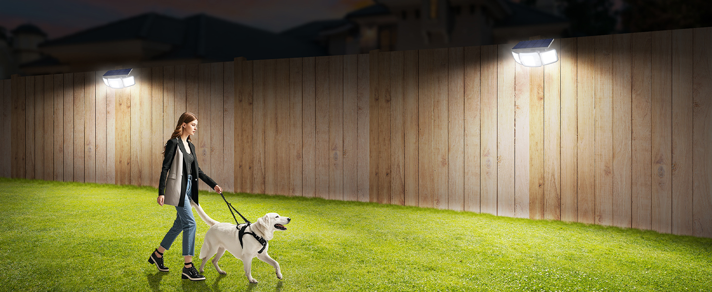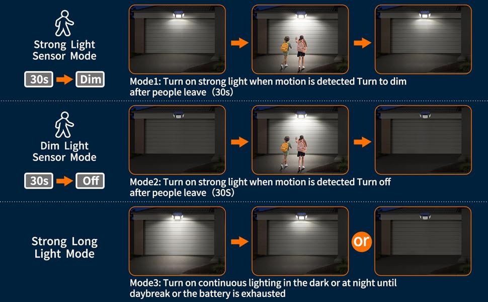 - 【2PIR SENSOR】The solar sensor light outdoor with dual sensor design has an effective sensing range of 180°, detecting a wider range of motion than a solar motion sensor light outdoor with a single motion sensor; when motion is detected at night, the solar light will automatically turn on and stay illuminated for 30 seconds; strong sunlight direct on the solar panel for 5 hours, the solar led security lights with motion sensor can continue to turn on the lights for 3 nights in the inductive mode,and the brightness is as high as 1200LM.