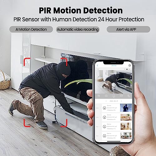 【PIR Motion Detection with AI Analysis Recognition】Equipped with advanced smart AI motion detection, this WiFi spy camera can accurately analyze and recognize people, vehicles. The AI PIR sensor is triggered in real-time as soon as the indoor security camera detects motion, and a notification is sent to your phone via the app.