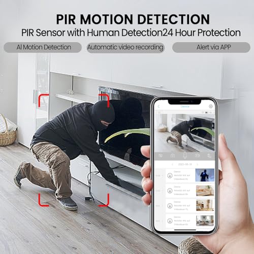 - 【PIR Motion Detection with AI Analysis Recognition】Equipped with advanced smart AI motion detection, this WiFi spy camera can accurately analyze and recognize people, vehicles. The AI PIR sensor is triggered in real-time as soon as the indoor security camera detects motion, and a notification is sent to your phone via the app.
