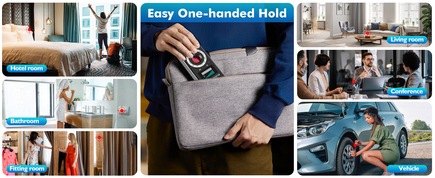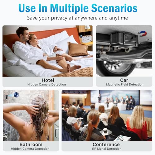 - Widely Application: this anti spy detector can scan bugs devices and protect your personal privacy or business security, and it can be widely used to scan these areas of high risk private home, hotel rooms, office rooms, conference rooms, dorms, public fitting rooms, public restrooms, bedrooms, bathrooms, rented houses, vacation rentals, AirBnBs. or as a daily used scanner prevent being photographed, shooting videos and monitor magnetic field signal. Protect you