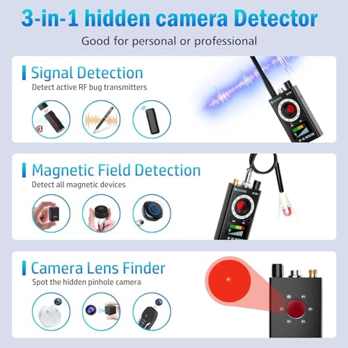 - Multi function : RF Signal Detection, Magnetic Field Detection, Camera Lens Finder and AI Auto Scan all these features built in this handheld device, detecting more spy devices and protects you as much possible.