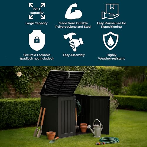 - GENEROUS CAPACITY – 775 litre capacity able to accommodate up to two Slimline 180L wheelie bins and perfect for garden equipment, tools, toys, and general outdoor gear storage.