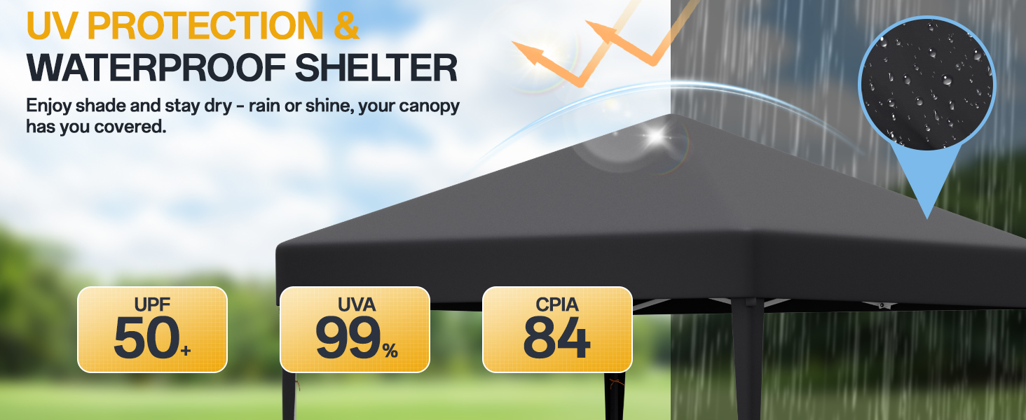 【UV50+ Sun & Rain Protection】 Oxford canopy with PU coating keeps you cool and dry. Blocks harmful UV rays while standing strong in light showers.