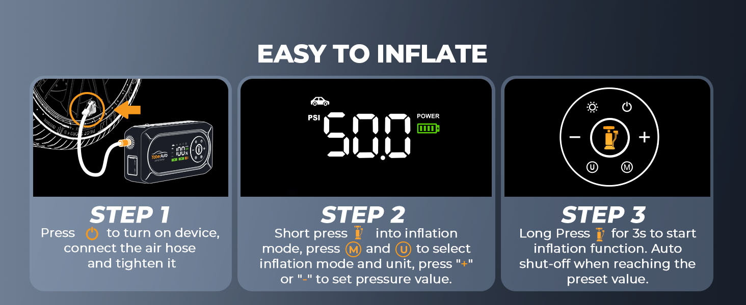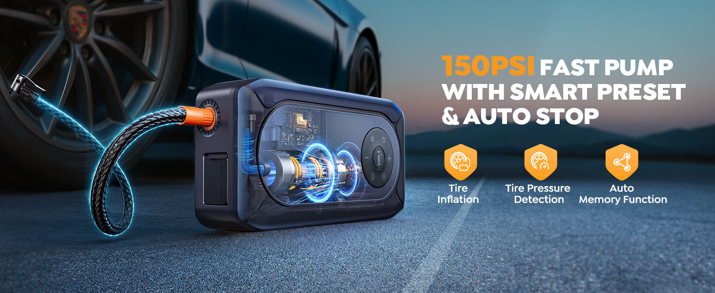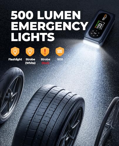 【150PSI CORDLESS DIGITAL INFLATOR】The portable jump starter with air compressor features a high-efficiency air compressor system capable of delivering 35L/Min, 3.3" Large LCD screen to read real-time tire pressure, 3 optional units(PSI, BAR, KPA), 5 inflation modes (Car, Motorcycle, Bicycle, Basketball and Custom Inflation, select Custom Inflation Mode to inflate up to 150 PSI), 4 different nozzles and and detachable extended air hose for inflating cars, bikes, balls, etc.