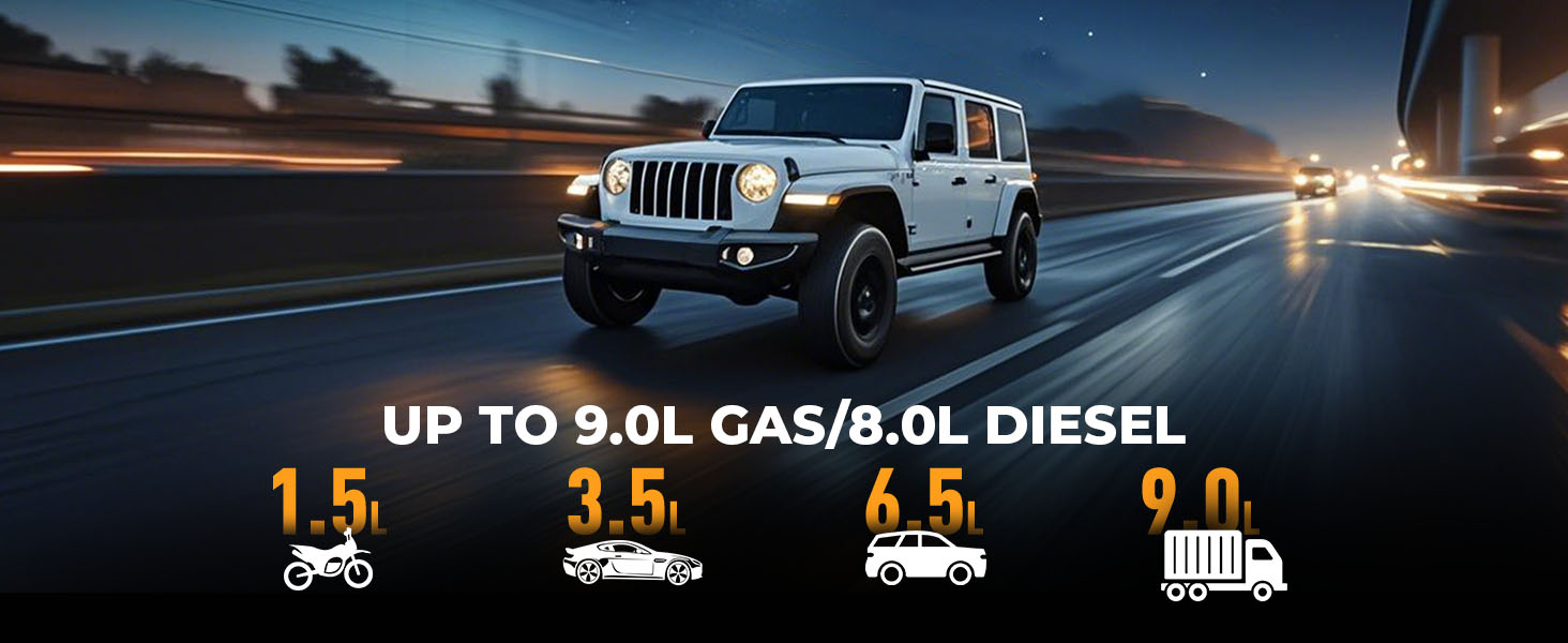 【PORTABLE CAR JUMP STARTER】Instantly start dead batteries with high amps of peak lithium power. This compact YaberAuto jump starter power pack is enough for starting car engines 10-20 times per charge. The jump starter also support "force start function", making it easy to start most vehicles like cars, motorcycles (up to 9L petrol or 8L diesel engines). This jump starter powe pack can jump-start vehicles in extreme conditions ranging from -20℃ to 50℃ (-4℉ to 122℉).