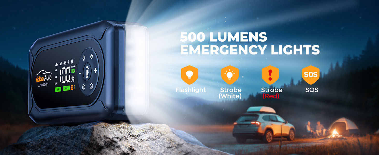 【500LM LIGHT】This car jump starter power bank has a 500 lumens LED light, and the LED light has dual colors and 4 modes: Lighting, Strobe(White), Strobe(Red), SOS. Whether you're inspecting your car during a road trip or need extra lighting while camping, rely on this powerful flashlight.