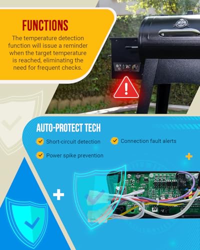 Timer Temperature Setting: The built-in timekeeping program helps you control cooking time; you can set the meat probe target temperature, and the control board will alarm when the temperature reaches the set value.
