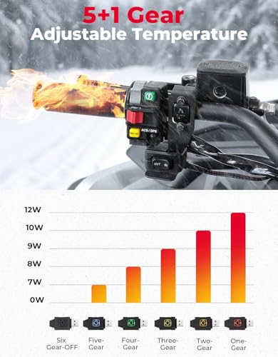 6 Level Adjustable Temperature: KEMIMOTO ATV heated grips are equipped with an advanced intelligent chip, offering 6 adjustable heat levels to suit any riding condition. Tackle chilly trails or freezing commutes while keeping your hands cozy. The safe neutral mode prevents battery drain with an automatic shutoff after a quick visual alert (5-second white light + 5 flashes)