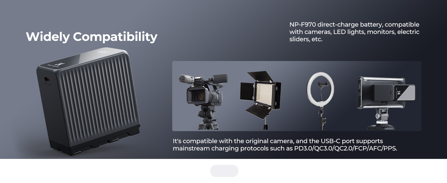 - PD 45W Fast Charging: 10500mAh Replacement Battery for NP-F970, Equipped with Type-C input port supporting 45W mainstream protocols: PD3.0/QC3.0/QC2.0/FCP/AFC/PPS, enabling rapid charging and discharging of the battery.