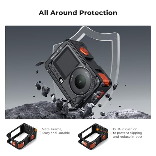 [Full Protection]: Crafted from high-strength aluminum alloy, this cage is built to be both lightweight and durable, offering comprehensive protection for your Osmo Action 6.Internal eva shock pads absorb impact from accidental drops, while the included silicone lens cover guards against scratches during storage.