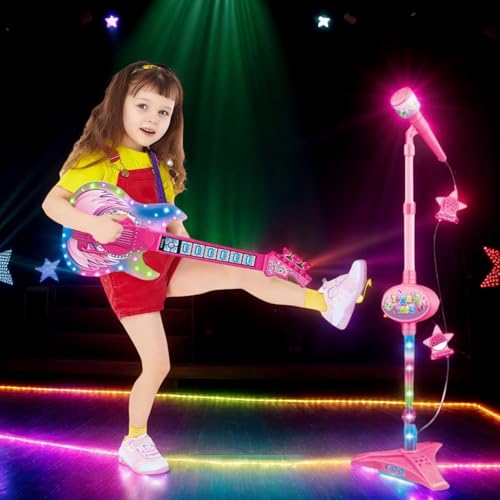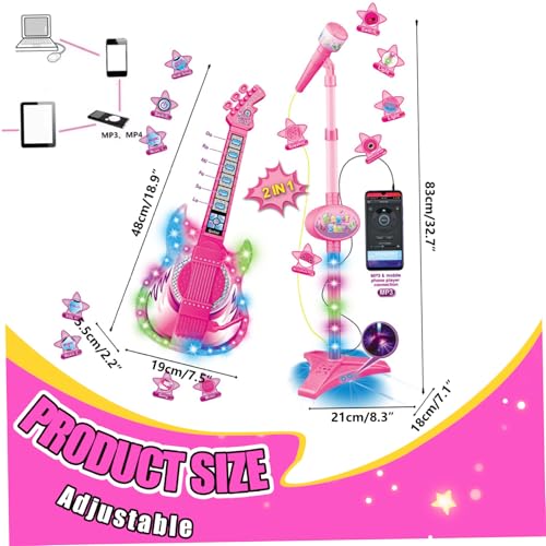 The Guitar and Microphone for Kids is a versatile 2-in-1 musical toy with an adjustable height stand, perfect for children ages 5-9 to explore music creatively; this kids electric guitar features bright lights and authentic sounds alongside a kids microphone with stand designed for comfortable use, crafted with non-toxic materials ensuring safety and longevity while supporting early learning through interactive play that enhances hand-eye coordination, rhythm, and confidence-making it an ideal kids guitar and microphone set for both fun and education.