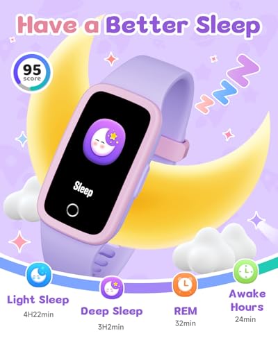 - [Comprehensive Health Monitoring] The kids' smartband supports 24/7 heart rate monitoring and sleep tracking (effective recording requires at least 3 hours of sleep). Through the companion app, parents can view daily heart rate trends and assess sleep quality with a detailed score based on the duration of light sleep, deep sleep, and REM sleep stages.