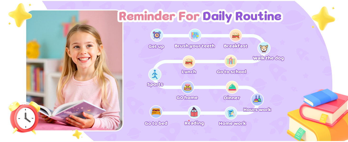 - [Cultivate Healthy Habits] Set customized reminders for meals, school, exercise, sleep, and more. With gentle vibration alerts, the tracker helps children gradually build a structured routine and overcome procrastination.