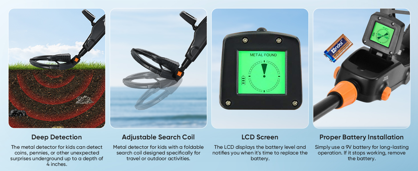 【Precise and Highly Sensitive】The sensitivity of the kid's metal detector can be controlled through the control buttons, allowing for precise detection of objects buried up to 10 centimeters/3.93 inches underground. It has accurate sensitivity, and you can use it to search for gold and silver jewelry, coins, and other metals like aluminum rings, small aluminum products, and gold, making it suitable for detection in various environments.