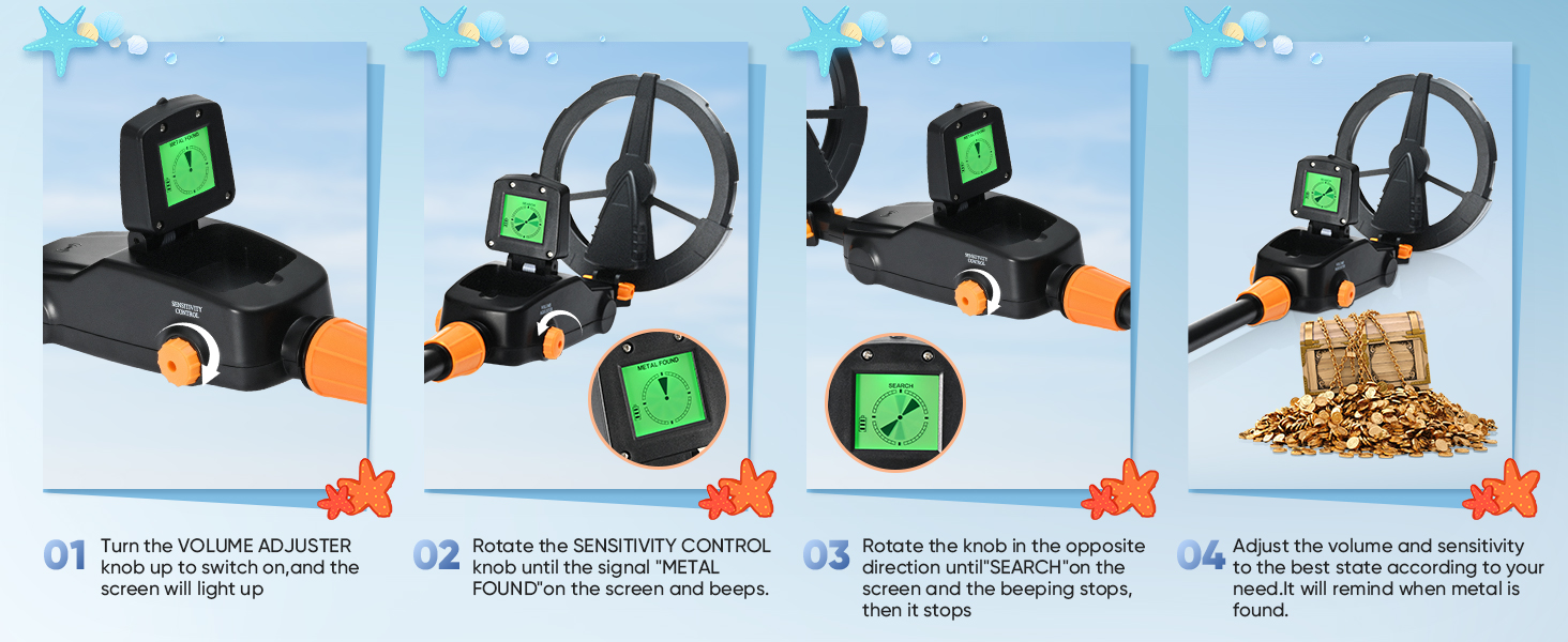 【LCD and SOUND Indication】The metal detector is equipped with an LCD display screen that shows the battery level. When the metal detector detects metal, it emits an alert sound and the display screen shows "METAL FOUND." The closer the metal is, the stronger the alarm sound and signal. You can easily adjust the alert volume and detection sensitivity through the control buttons.