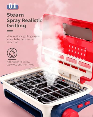 Realistic Grilling Fun: Enjoy sizzling sound effects, glowing lights, and real steam for an authentic BBQ experience. kid grill play set toy grill set kids sensory kitchen tools