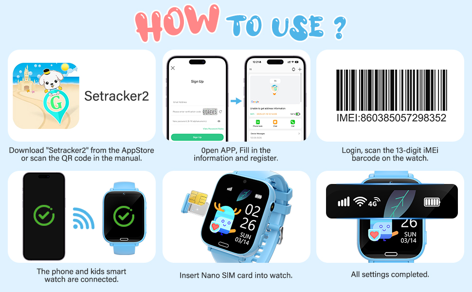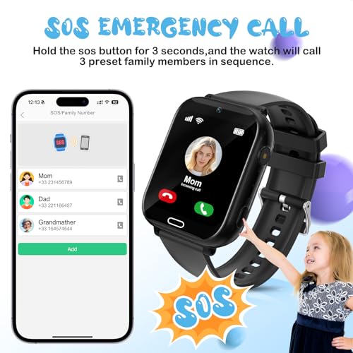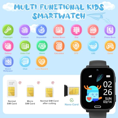 - 【4G Calls/Chat/Video/SOS】This GPS-enabled kids smartwatch supports HD video calls, voice messages, and phone calls. Simply insert a Nano-SIM card, and parents can stay connected with their child anytime. Pressing the power button for three seconds triggers an SOS emergency call (Note: Please turn off the watch before inserting the SIM card)