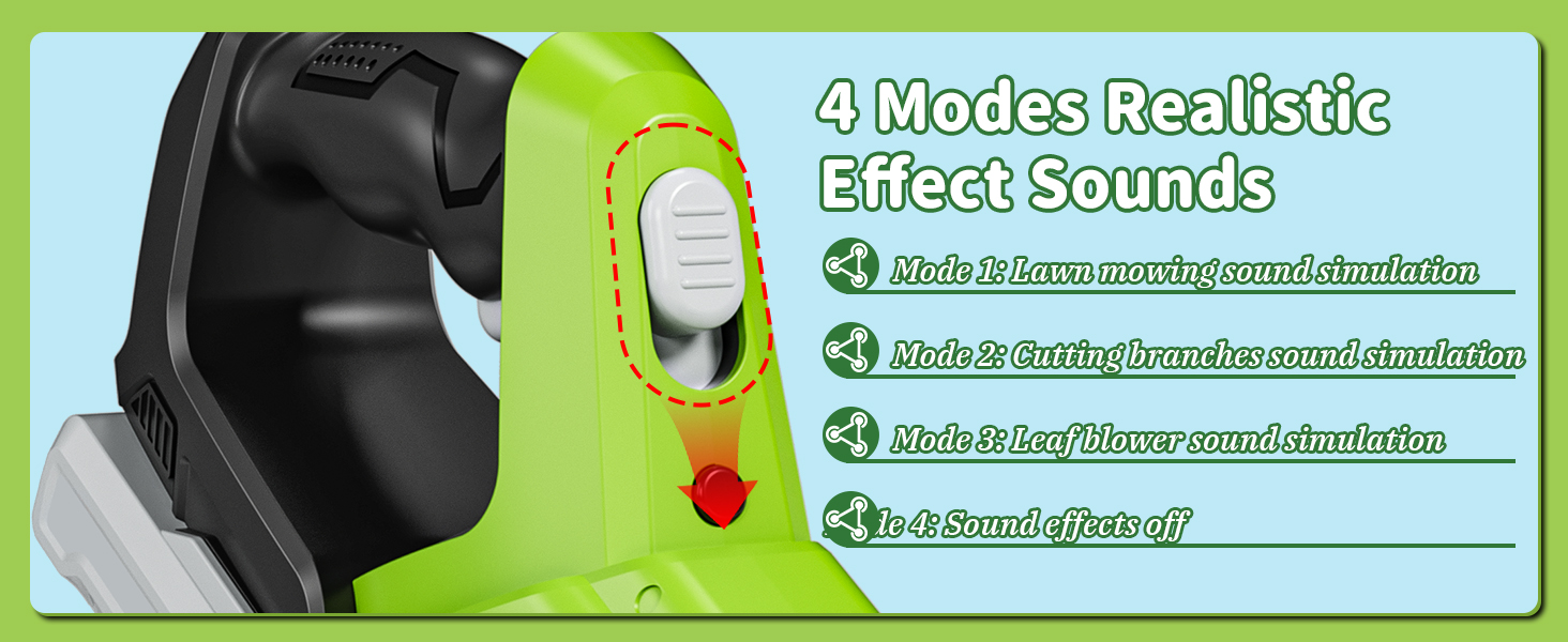 Immersive Audio Experience with Adjustable Volume: Bring the gardening experience to life with realistic sound effects tailored for each garden tool toy! The lawn mower produces a steady hum with dynatic led light while spinning, the leaf blower generates a powerful whooshing breeze, and the chainsaw revs with a vibrant cutting buzz. Our built-in volume control can ensuring enjoyable play without disturbing peace, this multi-sensory immersion deepens imaginative play.