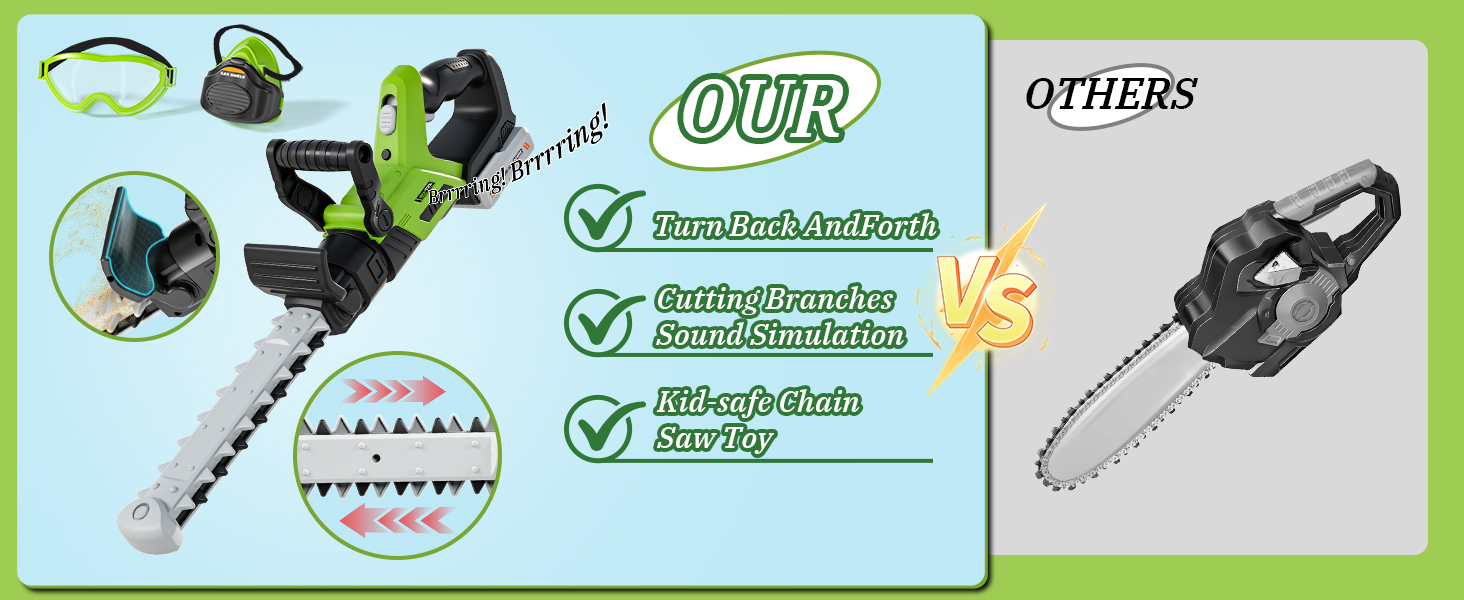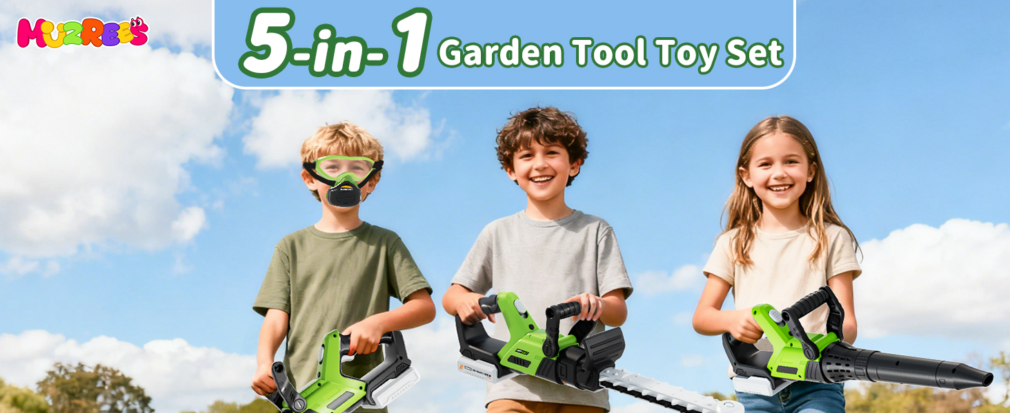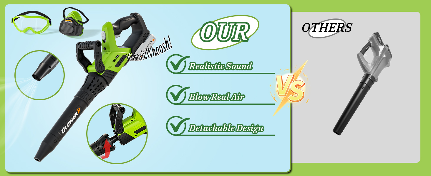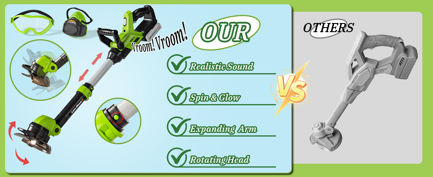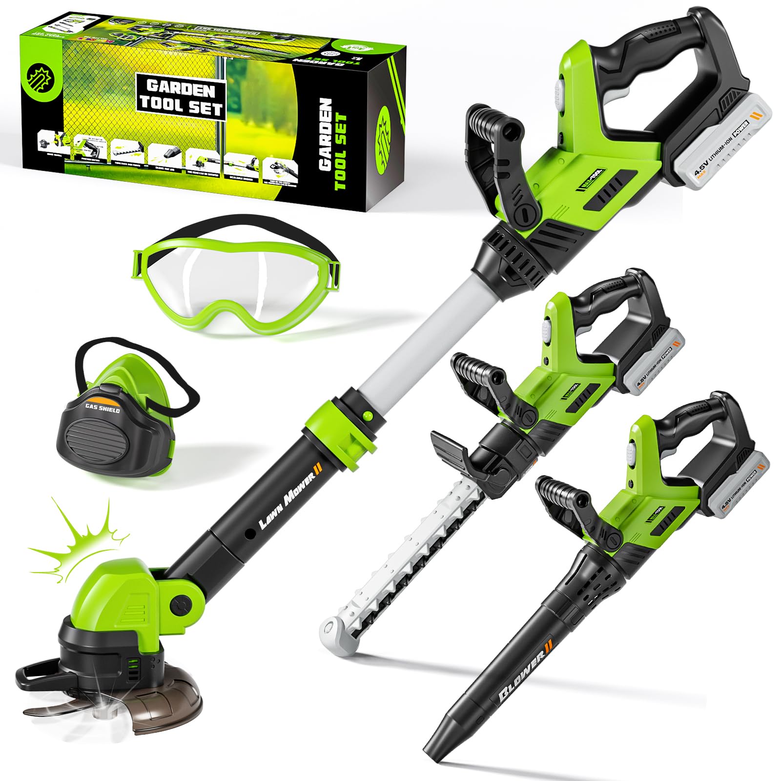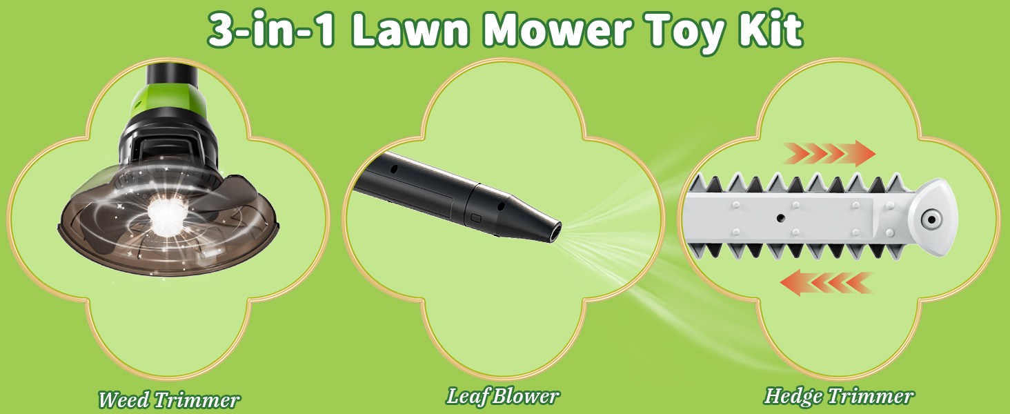 3-in-1 Garden Toy Kids Tool Set: This toddler toy features a powerful motor that instantly transforms into THREE professional tools: lawn mower toy (weed wacker), leaf blower toy , and chainsaw toy. With simple, secure attachments, kids can easily switch between roles—mowing grass, clearing leaves, or sawing logs with light and sound effect. This unique design not only saves space and cost but also teaches children about tool versatility and task planning. Watch as they master complete yard care routines that grows with them.