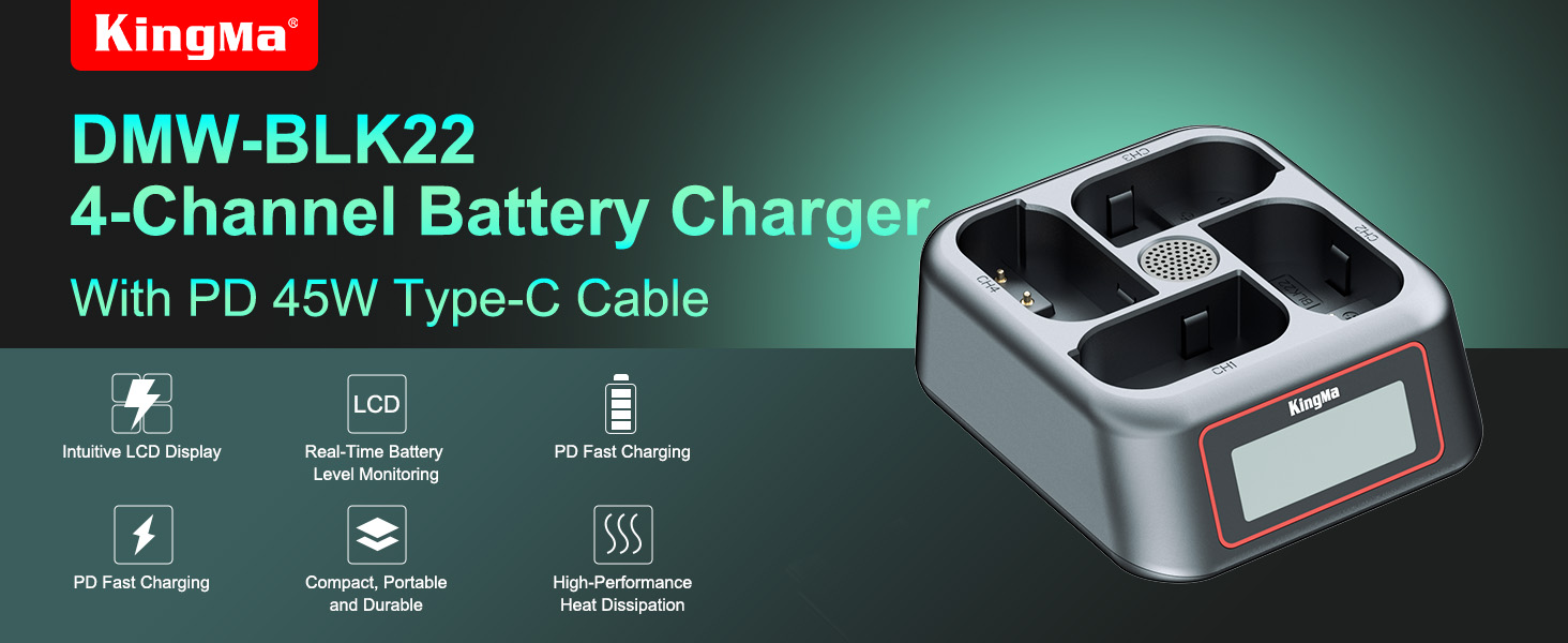 King Ma DMW-BLK22 Charger,4 Channel for Panasonic Lumix Camera Charger,45W PD Fast Charging with LED Display,Compatible with Panasonic Lumix DMC-GH3、DMC-GH4,DMC-GH5、DMC-GH5S、GH6、DC-S5