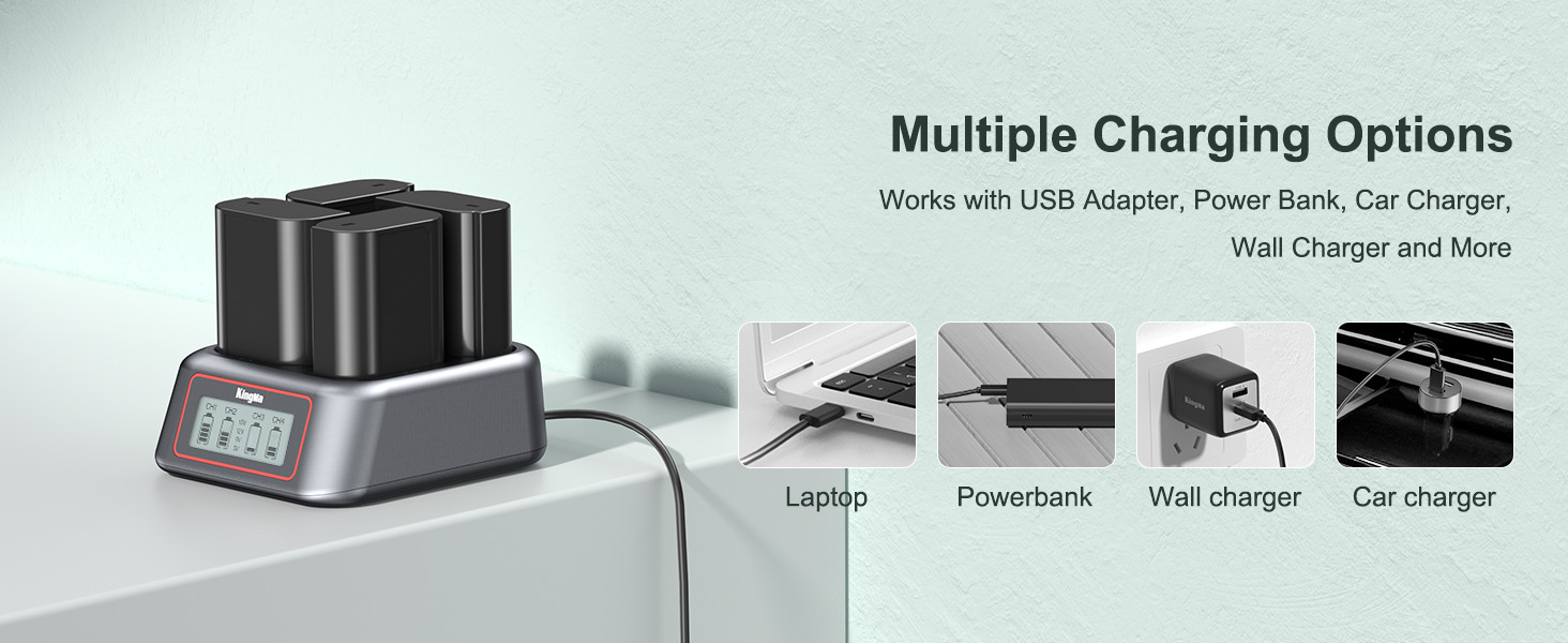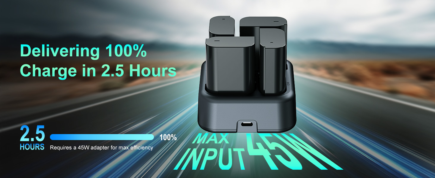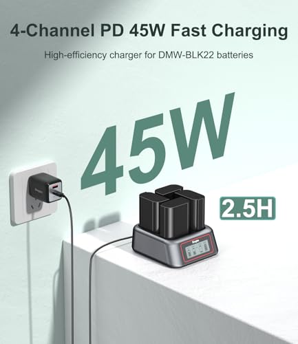 - 【4-Channel PD 45W Fast Charging】The Panasonic Lumix Camera Charger is equipped with 4 charging slots. Featuring a Type-C input port supporting the 45W PD fast-charging protocol, it supercharges four DMW-BLK22 batteries in 2.5 hours. This significantly improves charging efficiency and saves valuable time.