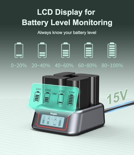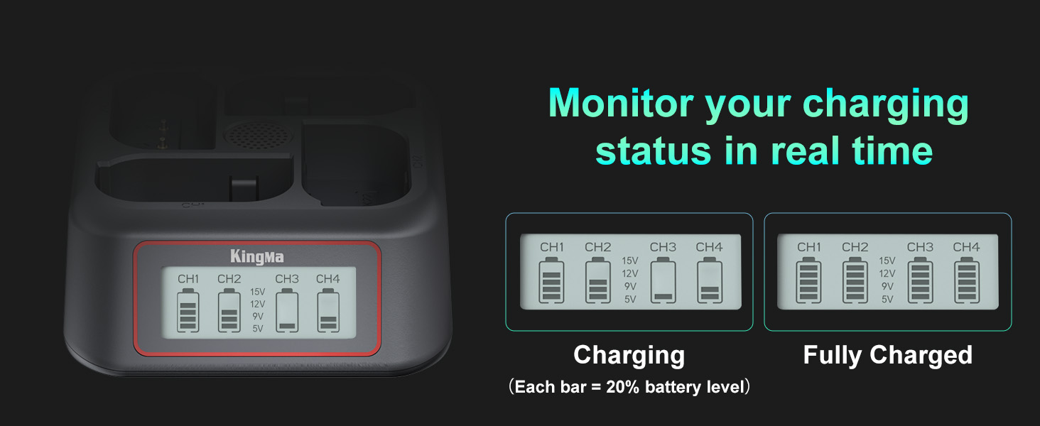 - 【LCD Display for Power Monitoring】Stay informed about your charging status with the intuitive LCD screen on the battery charger, which provides clear, granular updates on battery levels. Battery levels are displayed in 20% increments per slot: 1 bar = 0-20%, 2 bars = 20-40%, up to 5 bars = 80-100%. Once fully charged, the screen dims (only showing the battery icon), reducing unnecessary power consumption and ensuring efficient charging management.