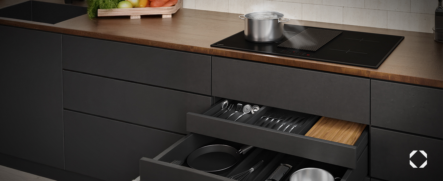 The integrated extractor boasts powerful air flow up to 597 m³/h in boost mode, quickly removing steam and odors directly at the cooking surface for a fresher kitchen.